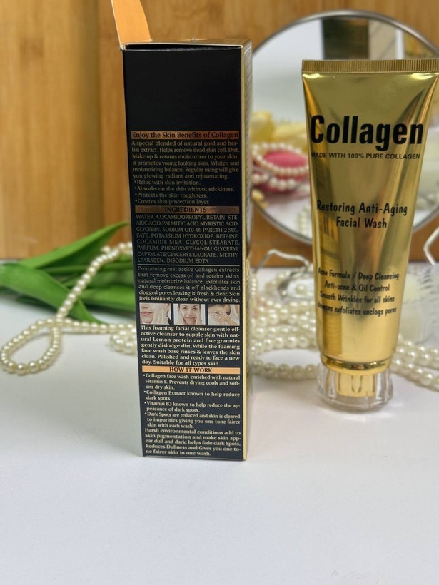 حاوی کلاژن ۱۰۰ درصد خالص است که کلاژن را در بافت هایپوست تحریک می کند و همین امر باعث جوانسازی و افزایش زیبایی چهره شما می شود. کلاژن از ایجاد آکنه جلوگیری می کند این محصول، غنی از ویتامین ها وآنتی اکسیدان های قوی است که پاکسازی عمیق صورت را انجام می دهد.
