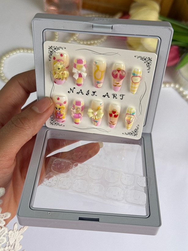 ناخن مصنوعی پینترستی بچگانه C1 یک ست فانتزی و جذاب از ناخنهای مصنوعی مخصوص کودکان است که با طراحیهای شاد، رنگهای پاستلی و المانهای کارتونی، جلوهای بانمک و کودکانه به دستان بچهها میبخشد.